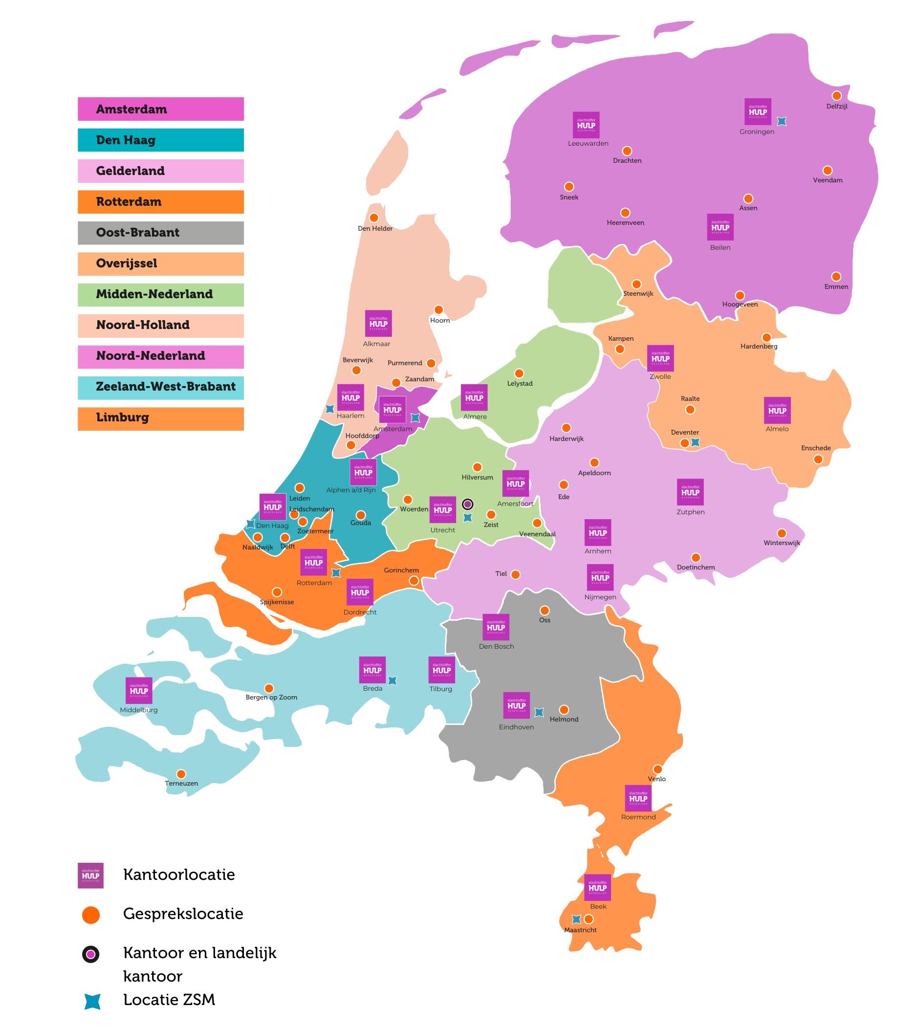 Op de afbeelding: locaties Slachtofferhulp Nederland