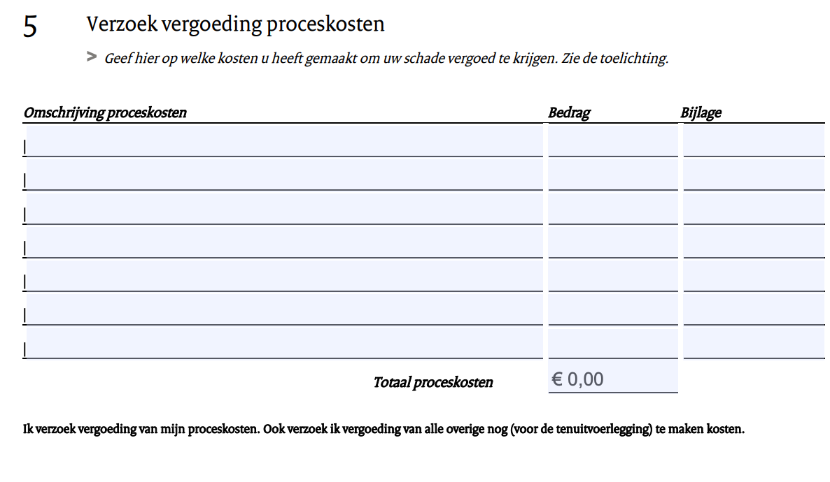 Deze kosten kun je invullen op het formulier 'Verzoek tot schadevergoeding' bij 4a.